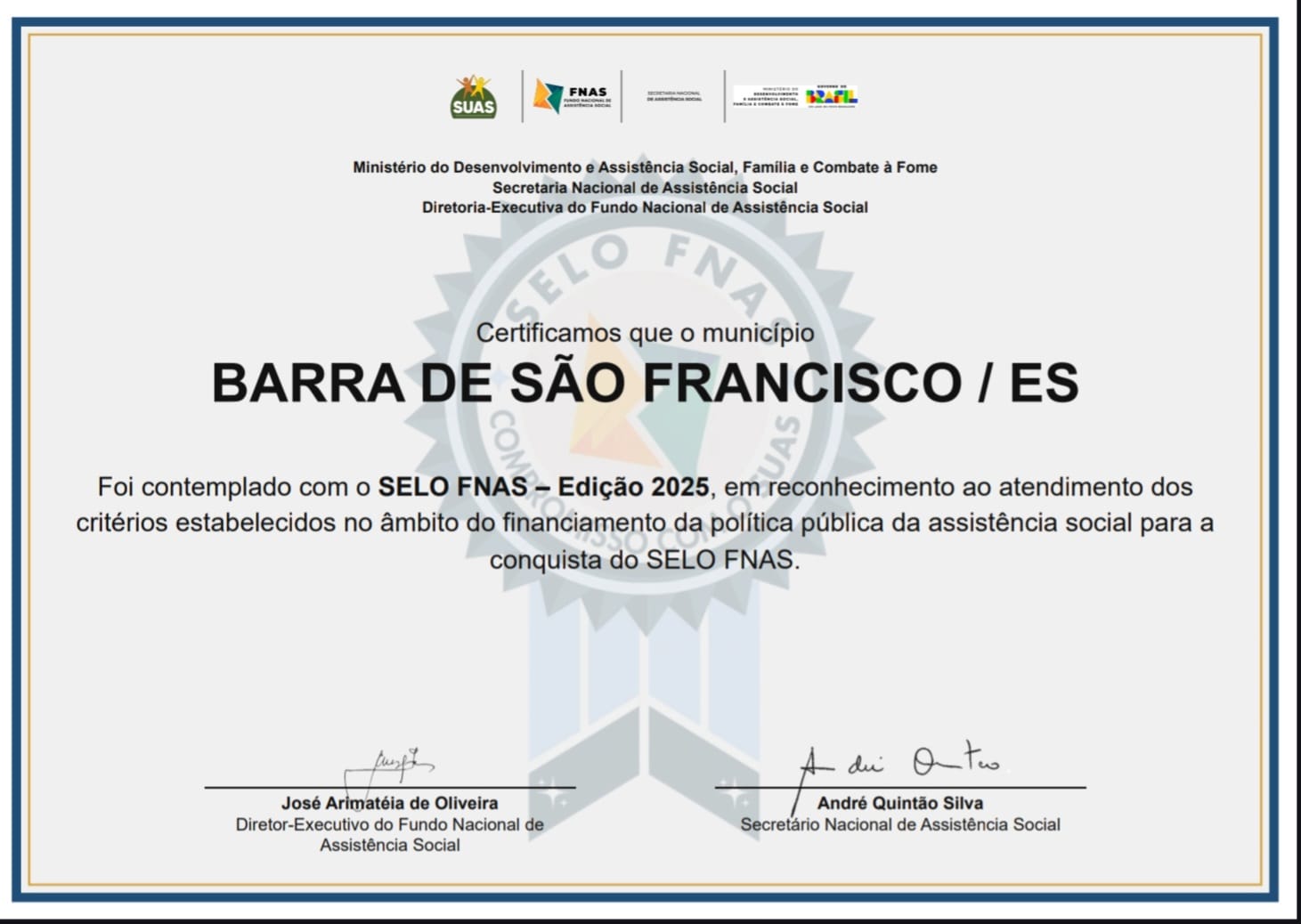 A Prefeitura de Barra de São Francisco, por meio da Secretaria Municipal de Assistência Social, conquistou o Selo do Fundo Nacional de Assistência Social (FNAS), uma certificação nacional que reconhece a qualidade da gestão dos recursos destinados à área. A premiação, concedida pelo Ministério do Desenvolvimento e Assistência Social, evidencia o compromisso do município com a responsabilidade, a transparência e a eficiência na aplicação dos recursos públicos no âmbito do Sistema Único de Assistência Social (SUAS).